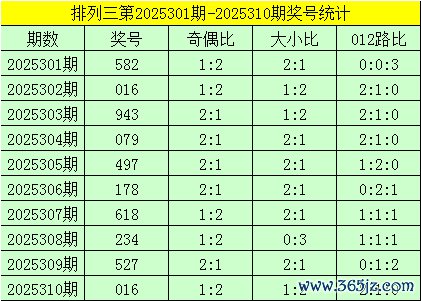 开奖回来:胪列三第2025310期奖号为:016,其奇偶比为1:2,大小比为1:2,奖号012路比为2:1:0。